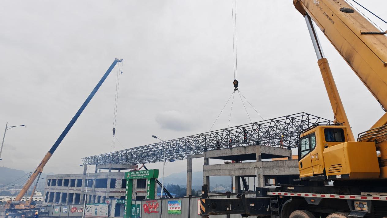 作为黔江区“十四五”重点工程,沿街配套及大门作为物流园形象展示核心构筑物,采用“智慧之门”设计理念,充分融合现代智慧元素与地域文化特色,主体结构均采用稳固的框架结构。施工过程中,项目团队运用BIM技术进行全流程数字化管控,不断优化施工工艺,成功克服连续降雨及高空作业等挑战,实现钢结构安装精准无误。